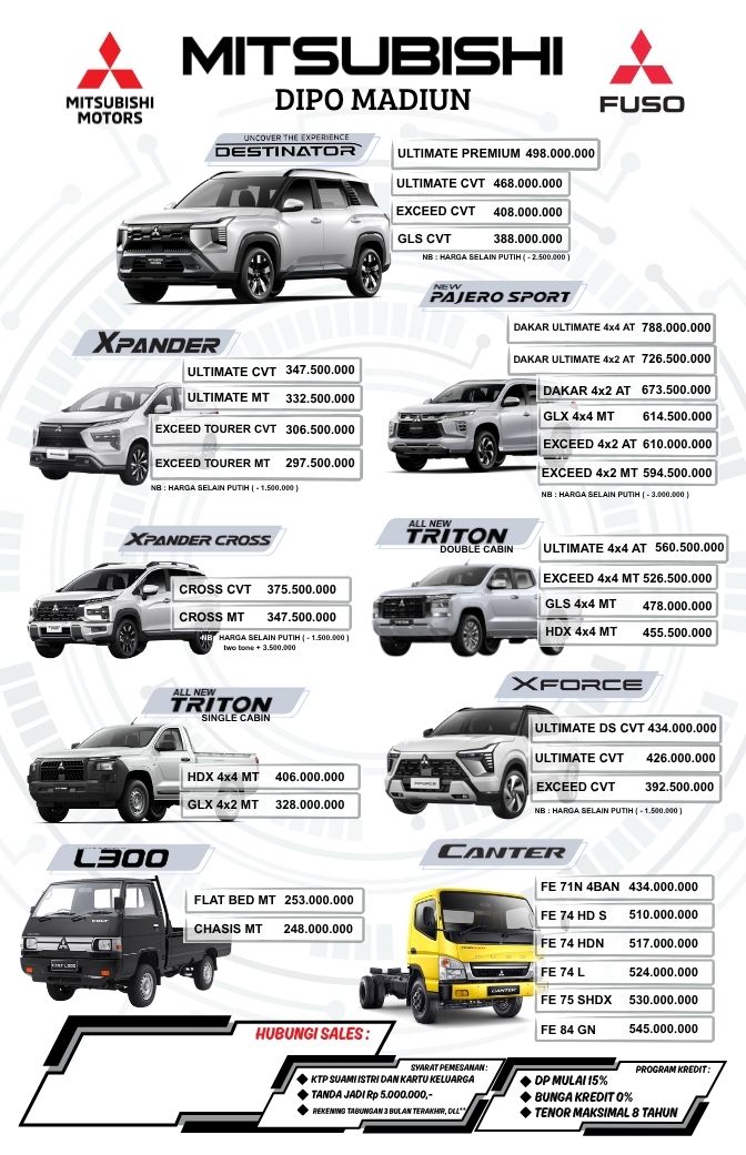 Untuk Informasi Kredit Mobil Mitsubishi di Madiun, Kredit Xpander Di Madiun, Kredit Xpander Cross Di Madiun, Kredit Xforce Di Madiun, Kredit Destinator Di Madiun, Kredit Pajero Sport Di Madiun, Kredit Triton Di Madiun, Kredit L300 Di Madiun, Kredit Fuso Canter Di Madiun, Kredit Fuso Fighter X Di Madiun.